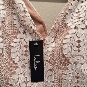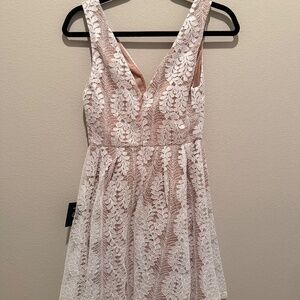 A stunning combination of white sheer lace and beige knit lining dances with you as you slay on the dancefloor all night long! Tank straps frame a plunging V-neckline with a supportive V-bar, plus a darted bodice. Fitted waist sits above a flaring, full skater skirt. Hidden back zipper/clasp.