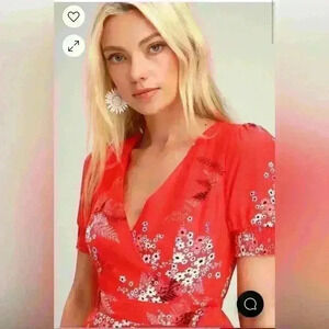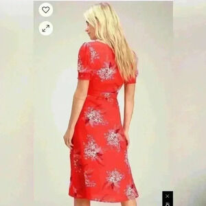 NWT Lulus All the Sweetness Red Floral Print Puff Sleeve Midi Wrap Dress