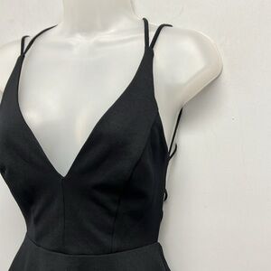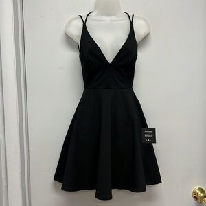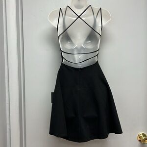 New with tags. The Lulus Believe in Love Black Backless Skater Dress will make a romantic out of you! You're sure to catch 'em staring when you show up with this sexy-yet-sweet medium-weight ponte knit skater dress and its super strappy backless design. A flattering plunge neckline, framed by princess seams, tops the fitted waist. Flared skater skirt finishes off this flirty dress. Hidden back zipper.