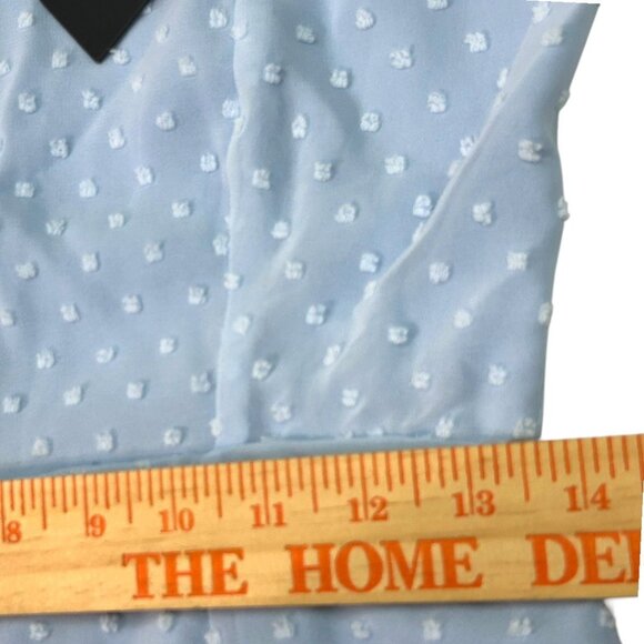 This midi dress offers a sophisticated design with light blue Swiss dot fabric, adjustable tie straps, and a flowy hemline. Designed for casual or semi-formal wear.