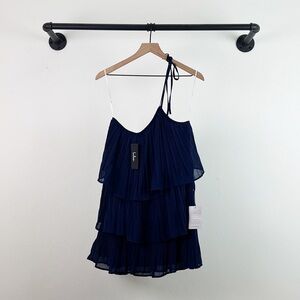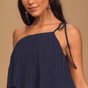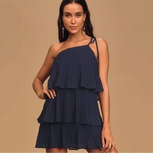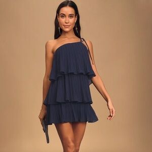 NWT Lulus Blowing Kisses Navy Blue Pleated One-Shoulder Mini Dress