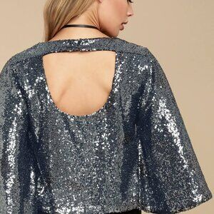 Light up the room in the Captivate Navy Blue Sequin Crop Top! Shiny navy blue sequins, with an iridescent sheen, fall from a rounded neckline, into wide, three-quarter bell sleeves. Wide-cut, cropped bodice and back cutout with double button closure.