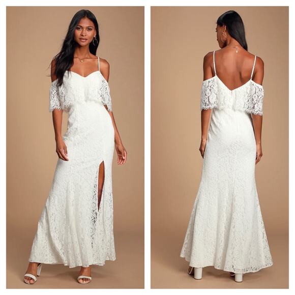 NWT Lulus Caterina White Lace Off-the-Shoulder Mermaid Maxi Dress Gown XS