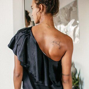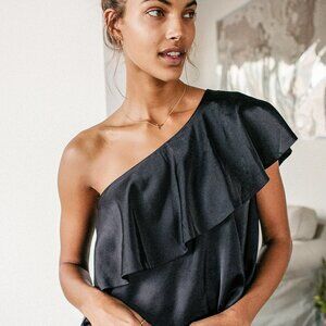 NWT Lulus Defining Style Black Satin Ruffled One-Shoulder Top