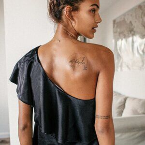 May be worn with a strapless bra, adhesive bra, petals, or no bra.