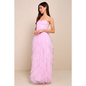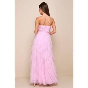 NWT Lulus Delightful Beauty Pink Mesh Strapless Ruched Ruffled Maxi Dress Size XS
