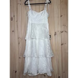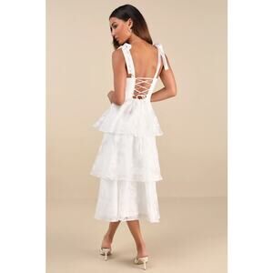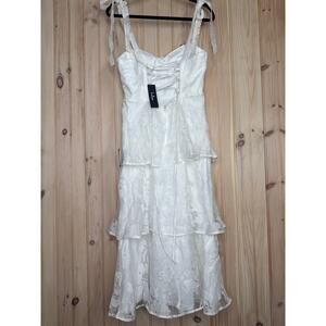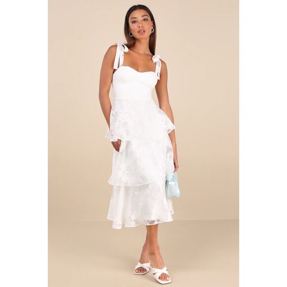NWT Lulus Drayson White Floral Burnout Tie-Strap Tiered Midi Dress Wedding Sz M
