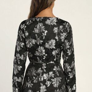 Look flawless for your next soiree in the Lulus Elegant Taste Black and Silver Floral Jacquard Mini Dress! Sleek woven fabric boasts metallic silver floral jacquard print throughout this dress and shapes a plunging V-neckline and a princess-seamed bodice framed by long sleeves. High-fitted waist ends at an A-line mini skirt. Hidden back zipper/clasp.