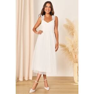 NWT Lulus Forever Celebrated White Swiss Dot Ruched Tulle Midi Dress Size L