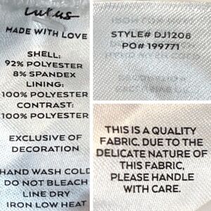 FABRIC: Shell & Lining: 92% Polyester, 8% Spandex. Contrast: 100% Polyester. Exclusive Of Decoration. Hand Wash Cold.