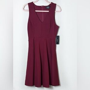 Medium-weight stretch knit forms a sleeveless bodice with a V-neckline and princess seams. A flirty midi-length, skater skirt falls from the fitted waist. Hidden back zipper/clasp.