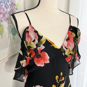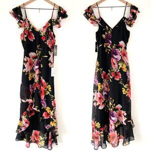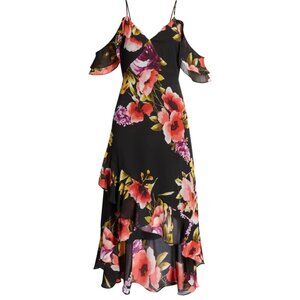 NWT Lulus Love In Bloom Cold Shoulder High-Low Floral Midi Dress Black Sz XS