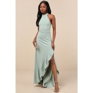 NWT Lulus Majestic Perfection Sage Green Ruffled Halter Maxi Dress Wedding Sz M
