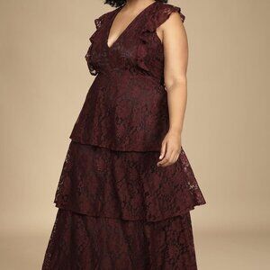 NWT Lulus Molinetto Burgundy Lace Ruffled Tiered Sleeveless Maxi Dress