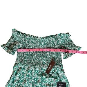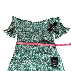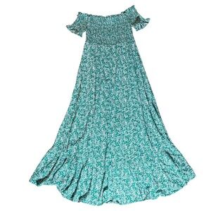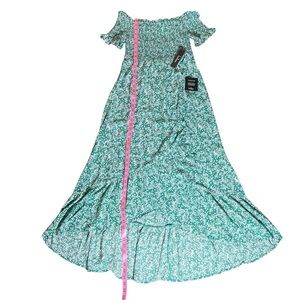 NWT Lulus Off Shoulder Green + White Floral Smocked High Low Maxi Dress, Medium