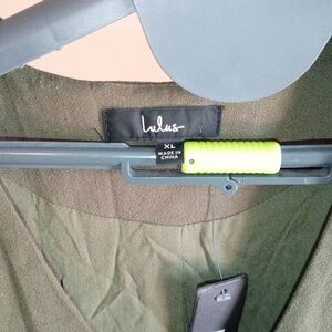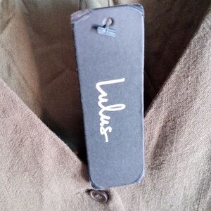 Elevate your style with this chic olive green vest from Lulu's, featuring a trendy cropped design and a buttoned front. Crafted from lightweight fabric, it offers a modern and comfortable fit, perfect for layering in any casual setting. New with tags. Needs ironing, dry cleaning, steaming, or wear it raw. two labels for content and care.
