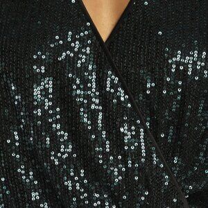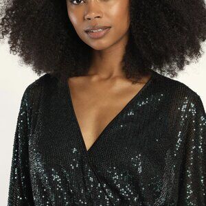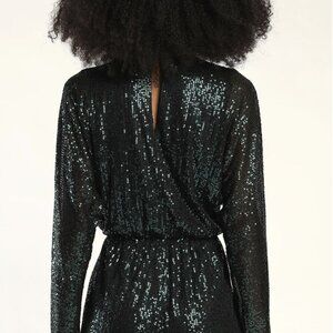 The fun never stops when you're rocking the Lulus Party 'til Morning Emerald Green Long Sleeve Romper! Stretchy mesh knit fabric, adorned with sparkling emerald green sequins, shapes this cute romper with a flattering surplice bodice (with a hidden modesty snap) framed by long, slightly sheer dolman sleeves. High, elasticized waist tops cute, flowy shorts. Button closure and keyhole detail at back.