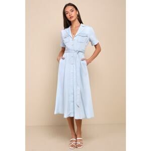 NWT Lulus Pleasant Cutie Blue Chambray Collared Midi Dress With Pockets Size L