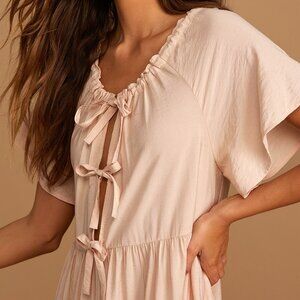 There's nowhere we'd rather be than right here with the Lulus Present Moment Blush Pink Bow Front Tiered Maxi Dress! This lightweight woven dress has a subtle pinprick texture across its short fluttery raglan sleeves, ruffle-trimmed drawstring neckline, and a trio of tying bows that secure the open front. Tiered maxi skirt has a flowy babydoll silhouette and side seam pockets.