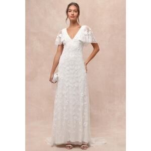 NWT Lulus Safiya White Sequin Flutter Sleeve Maxi Dress Wedding Bridal Bride S