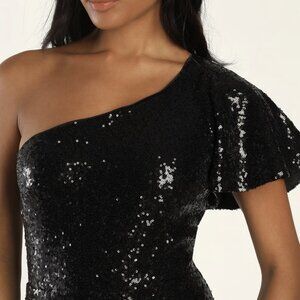 NWT Lulus Shimmering Star Black Sequin One-Shoulder Flutter Sleeve Dress (sz SM)