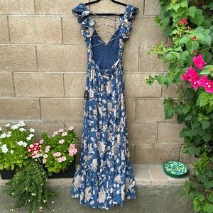 NWT Lulu’s Soiree Celebration Blue Floral Ruffled Lace-Up Maxi Dress Small Chic