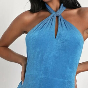 NWT Lulus Stunning Attitude Blue Keyhole Halter Neck Maxi Dress, Stretchy Knit.