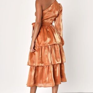 NWT Lulus Sweet Excellence Shiny Rust Orange One-Shoulder Tiered Dress