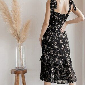 NWT Lulus Terrace Views Black Floral Print Tiered Midi Dress
