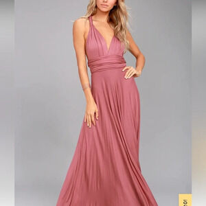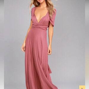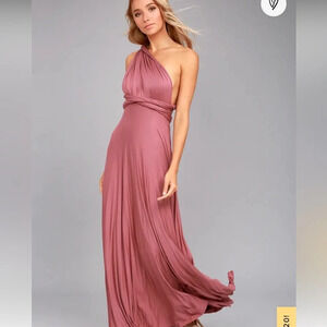 From website description- Versatility at its finest, the Lulus Tricks of the Trade Rusty Rose Maxi Dress knows a trick or two... or four! Two, 63” long lengths of fabric sprout from an elastic waistband and wrap into a multitude of bodice styles including halter, one-shoulder, cross-front, strapless, and more. Stretchy jersey knit hugs your curves as you discover new ways to play with this fascinating frock. Full, maxi-length skirt has a raw hemline