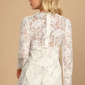 NWT Lulus Express Your Love White Lace Long Sleeve Romper! Romantic white lace and a beige satin lining come together to form a deep V-neckline, a princess-seamed bodice, and long sheer sleeves. Empire waist tops tailored shorts that end with scalloped hems. Hidden back zipper/clasp.