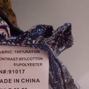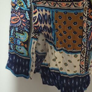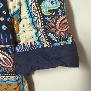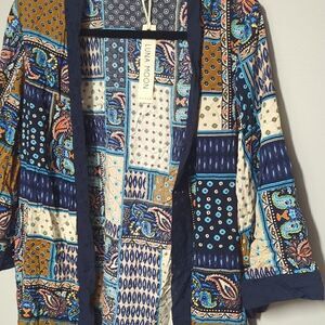 Blue, cream, teal, orange, tan and pink patchwork look open front cardigan. Blue eyelet trim.