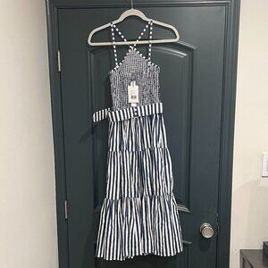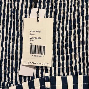 This adorable Lusana Dress is a chic and sophisticated with a fitted, halter neck bodice. There are adjustable thin straps provide a customizable fit and the buckle belt at the waist cinches in for definition. The shirk has lots of movement and it's perfect for day-to-night look. This is BRAND NEW WITH TAGS and has never been worn. Easy to dress up or down.