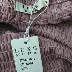 This is a really unique dress from Luxe Moda that is new with tags. It's a velvet dress in a dusty rose color with a dramatic silhouette. It's an off the shoulder bodice with a low empire waist and a flared skirt that ends at the mid-thigh. It's a long sleeve dress with layered bell sleeves, and it is a size small.