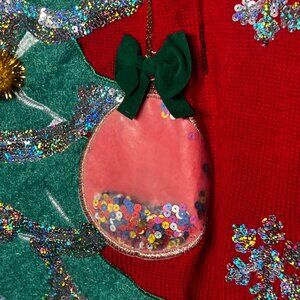 * Sequin, patchwork, filled ornament with movable sequins, embroidered, bow, pom poms