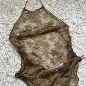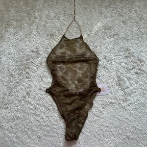 NWT M Savage X Fenty Chantilly Teddy olive lace chain halter Bodysuit open back