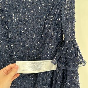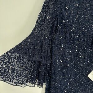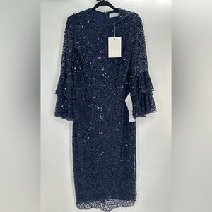 NWT MAC DUGGAL 10802 Navy Fully Sequined Ruffle Tiered 3/4 Sleeve Midi Dress
