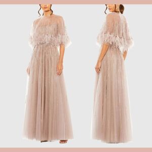 NWT MAC DUGGAL [ 6 ] 42098 Embellished A Line Dress w/ Feather Detail Cape Mocha
