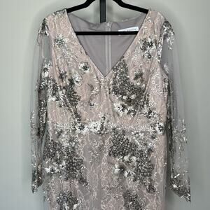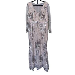 NWT MAC DUGGAL 67539 Platinum Embellished V-Neck Illusion Long Sleeve Gown Women Size 14
