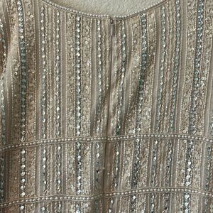 Nude Chiffon Gown Fully Beaded 1/4 Sleeve Top dress from Mac Duggal. missing a couple of sequins on the shoulder as shown and one rhinestone on the front could use a little reinforcement.