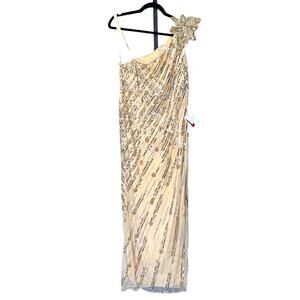 NWT MAC DUGGAL 93739 Nude Gold Embellished Floral Detail One Shoulder Gown Women