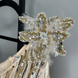 Floral detail atop left shoulder accented by dainty feathers, beads, and sequins