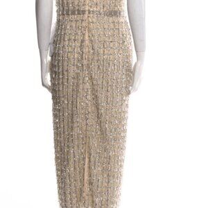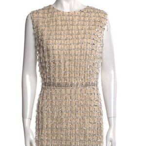 NWT MAC DUGGAL EMBELLISHED HIGH NECK FRINGED MIDI SHEATH DRESS NUDE 5471