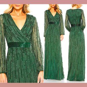 NWT MAC DUGGAL Emerald Sequin-Embellished Gown Bishop-Sleeves 6 MSRP $598