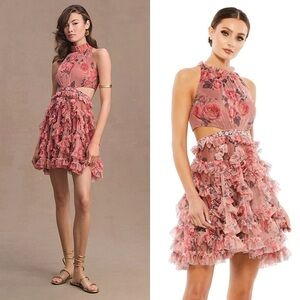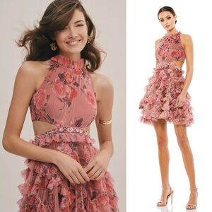 Blending edgy modernism and timeless sophistication, this Mac Duggal dress features romantic ruffled details, flouncy A-line mini skirt, and alluring side cutouts accented by an embellished waistband. The high halter neckline combined with the whimsical floral print produce a look that's guaranteed to be remembered.