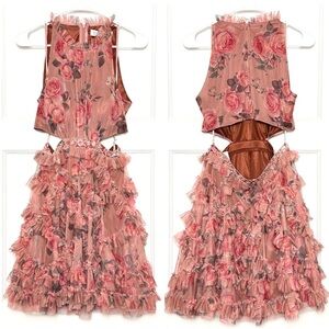 NWT MAC DUGGAL Floral Ruffle Tulle Sleeveless Beaded Cutout Waist Halter Dress 6
