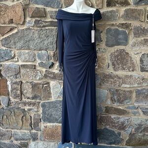 NWT MAC DUGGAL Navy Beaded Cuff Drop Shoulder Faux Wrap Gown size 10