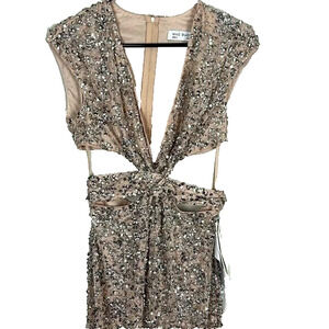 NWT MAC DUGGAL SZ 0 10919 SEQUINED CAP SLEEVE PLUNGE NECK CUT OUT GOWN NUDE