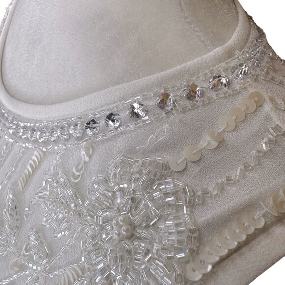 Chic sleeveless midi dress with rows of vertically-striped sequins throughout. Intricate, hand-beaded flowers adorn the bodice and skirt, and crystals accent the neckline and waist.