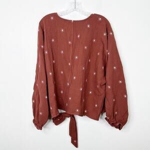 Elevate your wardrobe with this stunning Madewell Lightspun Wrap Top in Burnished Mahogany. The blouse features a beautiful floral pattern, V-neckline with tie closure, and collarless design. The top has long balloon sleeves with embroidered accents, adding a touch of elegance to your outfit. The relaxed fit and cropped style are perfect for a vintage 70s look.